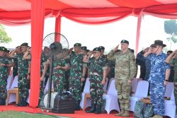 “Saya menyampaikan rasa bangga, terima kasih sebesar-besarnya dan penghargaaan atas penampilan saudara, disiplin dan semangat saudara hari ini”, kata Menhan Prabowo.