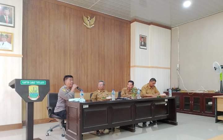KARAWANG | Suaralintasindonesia.com – Polsek Tirtajaya Polres Karawang Polda Jabar, Kapolsek Tirtajaya Iptu Hasanudin,S.Pd mengikuti kegiatan rapat minggon keliling tingkat Kecamatan Tirtajaya Kabupaten Karawang dan Menyampaikan Himbauan Kamtibmas terkait Persiapan Pemilu tahun 2024 diwilayah Hukum Polsek Tirtajaya. Selasa (21/11/2023)