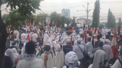 menggelar aksi masa bela Palestina, di samping kantor Pemda Karawang penuh dipadati aksi massa dari berbagai kalangan.