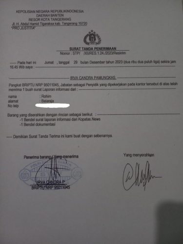 Ditempat yang berbeda_ Atas dasar pengaduan awak wartawan Kopatas.News akhirnya resmi melayangkan surat LI (Laporan Informasi) Hari Jumat,29 Desember 2023 ke Polresta Tigaraksa, terkait insiden menghalang-halangi dalam menjalankan tugas jurnalis, dan laporan tersebut sudah diterima oleh pihak Polresta Tigaraksa. Dan bukan hanya akan layangkan kami jajaran redaksi akan segeramengambil jalur hukum dengan membuat laporan susulan terkait pasal ini tutupnya.