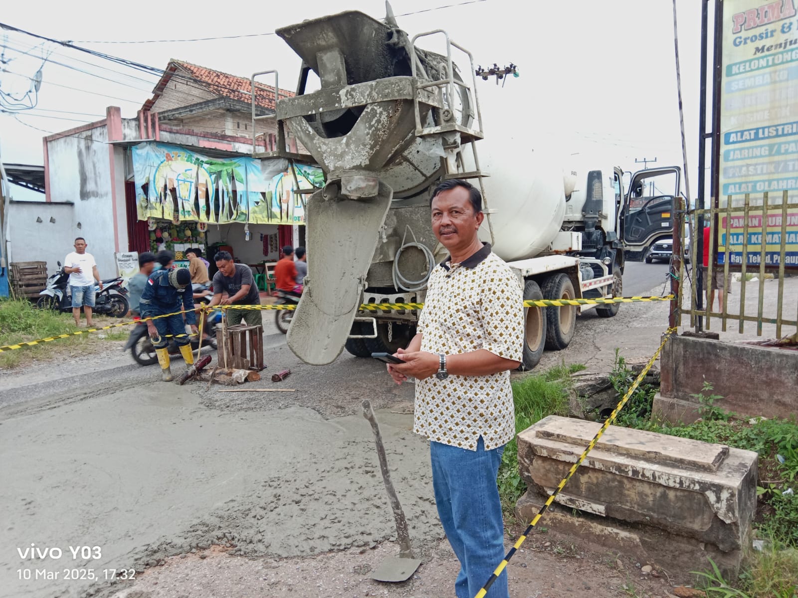 Agus Cik Salah seorang tokoh masyarakat mantan kepala Desa Tekad yang begitu perduli atas lingkungan pada senin”10//03//2025 Beliau menurunkan mobil truk molen cor, untuk mengecor jalan yang rusak.