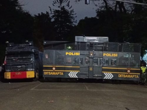 Namun, menjelang malam sekitar pukul 19.30 WIB, situasi mulai memanas. Massa aksi melakukan pelemparan yang kemudian memicu aparat kepolisian melepaskan tembakan water canon dan gas air mata untuk membubarkan kerumunan.