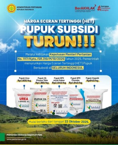 Jakarta.Suaralintasindonesia.com-Menteri Pertanian (Mentan), Andi Amran Sulaiman mengatakan bahwa harga pupuk subsidi turun sebesar 20% mulai hari ini (22/10/2025), di seluruh wilayah tanah air.