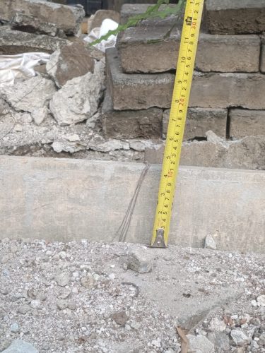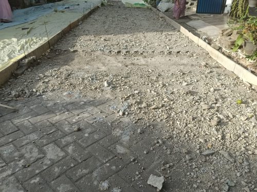 Sebelum dilakukan pengecoran, dasar jalan semestinya dipadatkan menggunakan mesin woles untuk memastikan struktur beton dapat menempel sempurna dan memiliki daya tahan sesuai standar. Namun kondisi di lapangan memperlihatkan bahwa permukaan dasar tidak dirapikan, bahkan masih terdapat sisa material lama seperti potongan hotmix dan paving block yang belum dibersihkan.