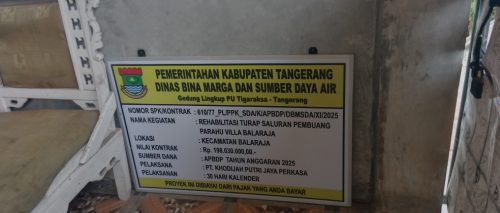 Kabupaten Tangerang | suaralintasindonesia.com – Proyek Pembangunan Rehabilitasi Turap Saluran Pembuangan di Perumahan Villa Balaraja, Desa Saga, Kecamatan Balaraja, Kabupaten Tangerang, mangkrak dan menuai protes dari warga. Proyek yang didanai APBDP Tahun Anggaran 2025 senilai Rp. 198.030.000,00 dan dilaksanakan oleh PT. Khodijah Putri Jaya Perkasa dengan waktu 30 hari kalender ini, dinilai tidak bertanggung jawab karena tanah bekas galian tidak diratakan kembali. Sabtu (27/12/2025)